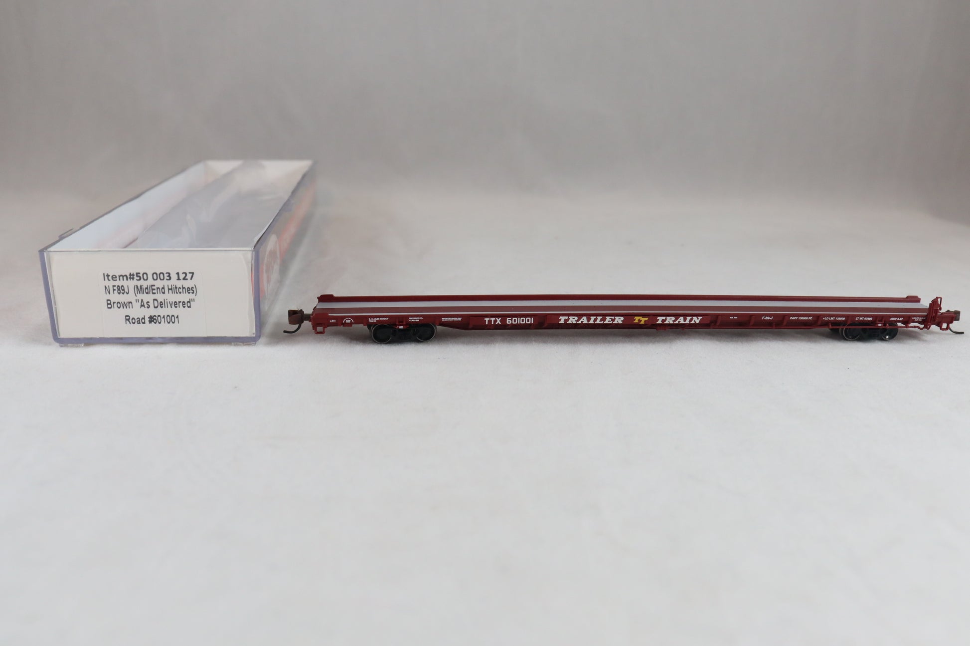Atlas® - 50 003 127 - 89' NF89J (Mid/End Hitches) Brown "As Delivered" Flat Car - Trailer Train #601001 - N Scale